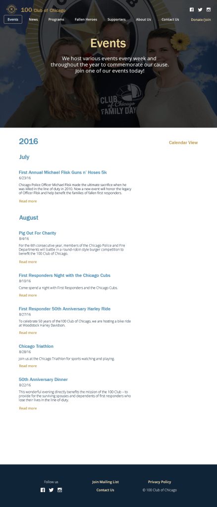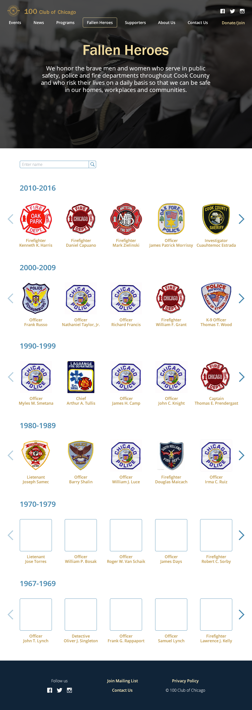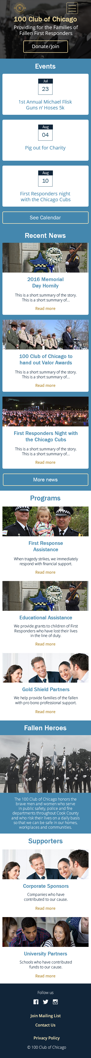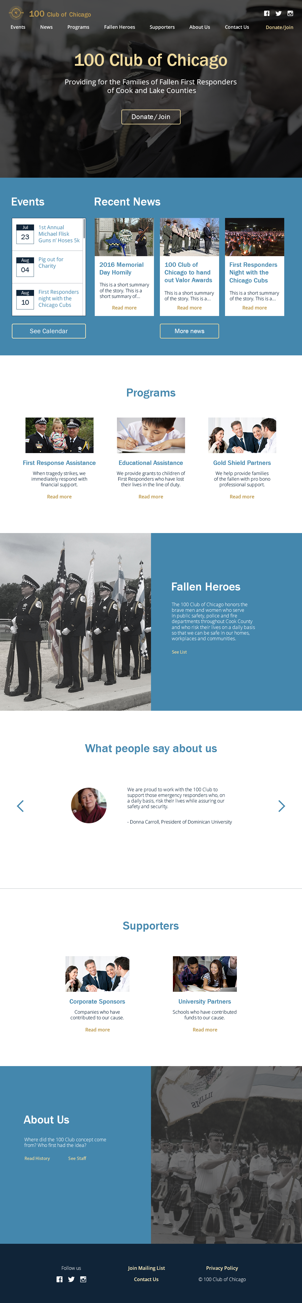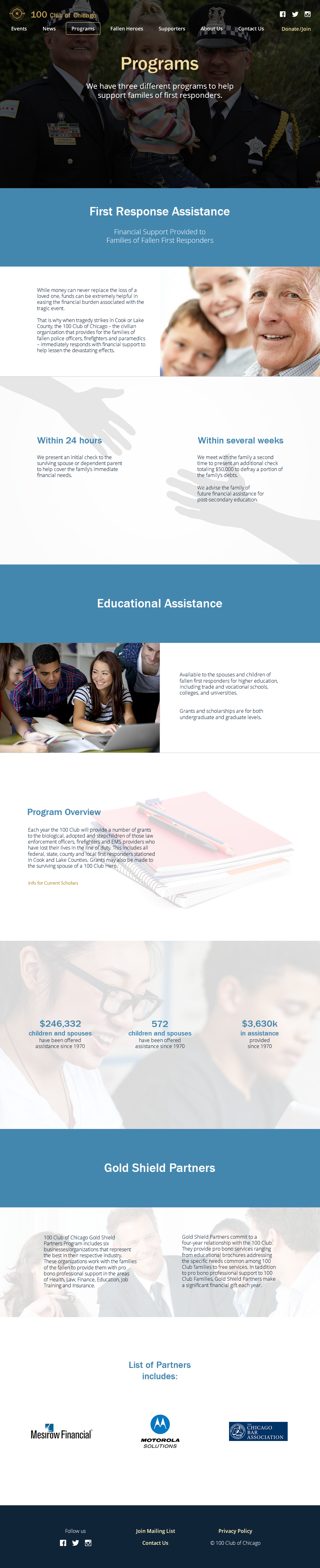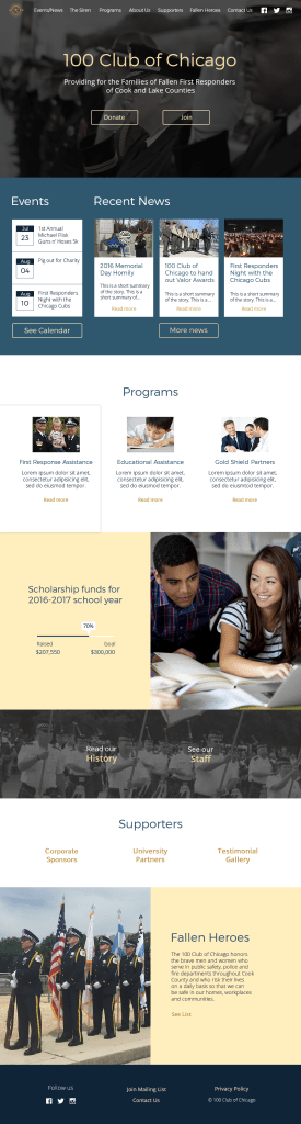 100 Club of Chicago provides financial and emotional support to the families of first responders (such as policemen and firefighters) who lost their lives in the line of duty. To honor these heroes and their history, the club holds events and gathers support through donations and other organizations’ contributions. Marking their 50th anniversary, they sought to refresh their web presence by updating their website.