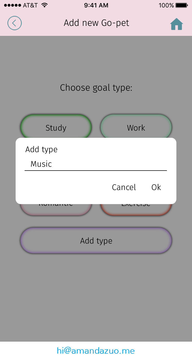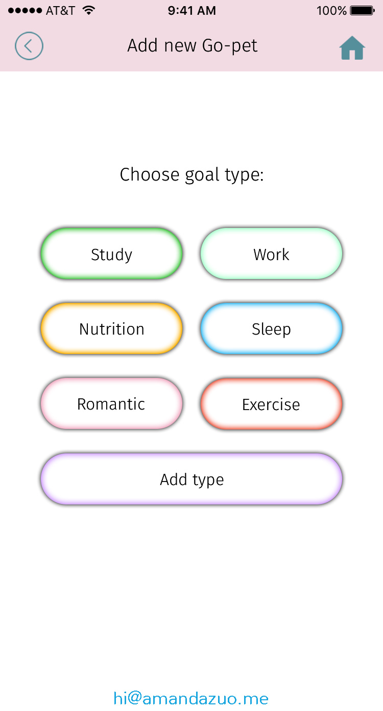 The user has a list of goal types to choose from when they add a new Go-pet, but they can manually add a new type of goal if it isn’t on the list.