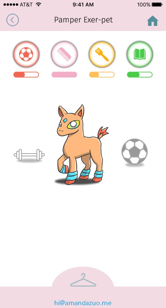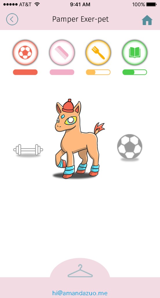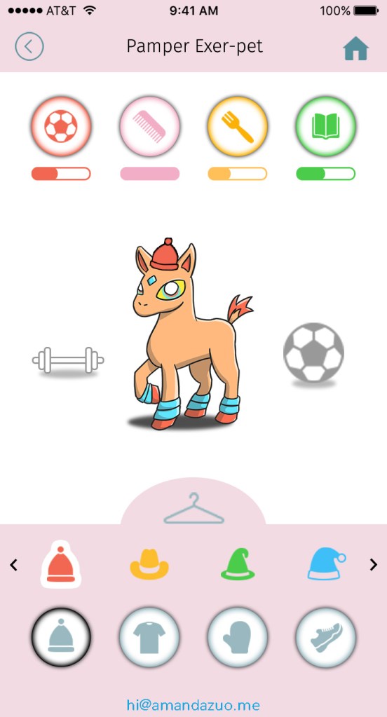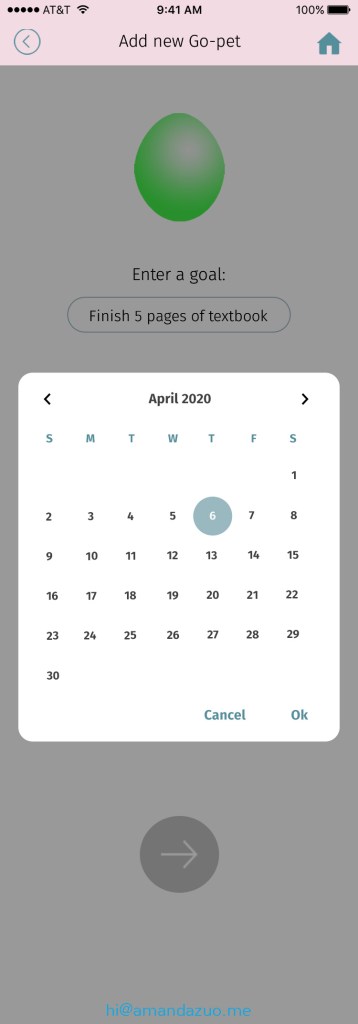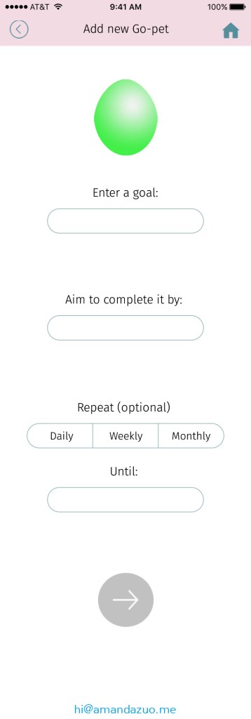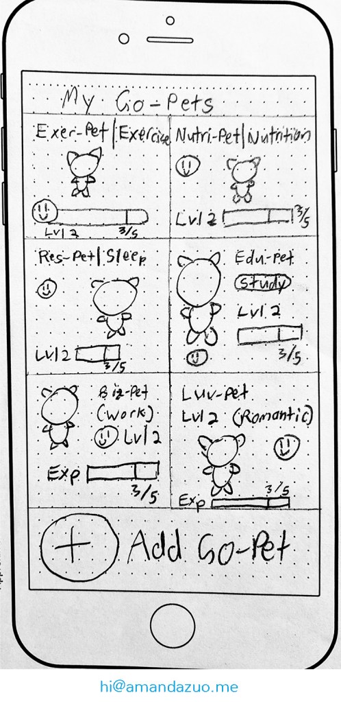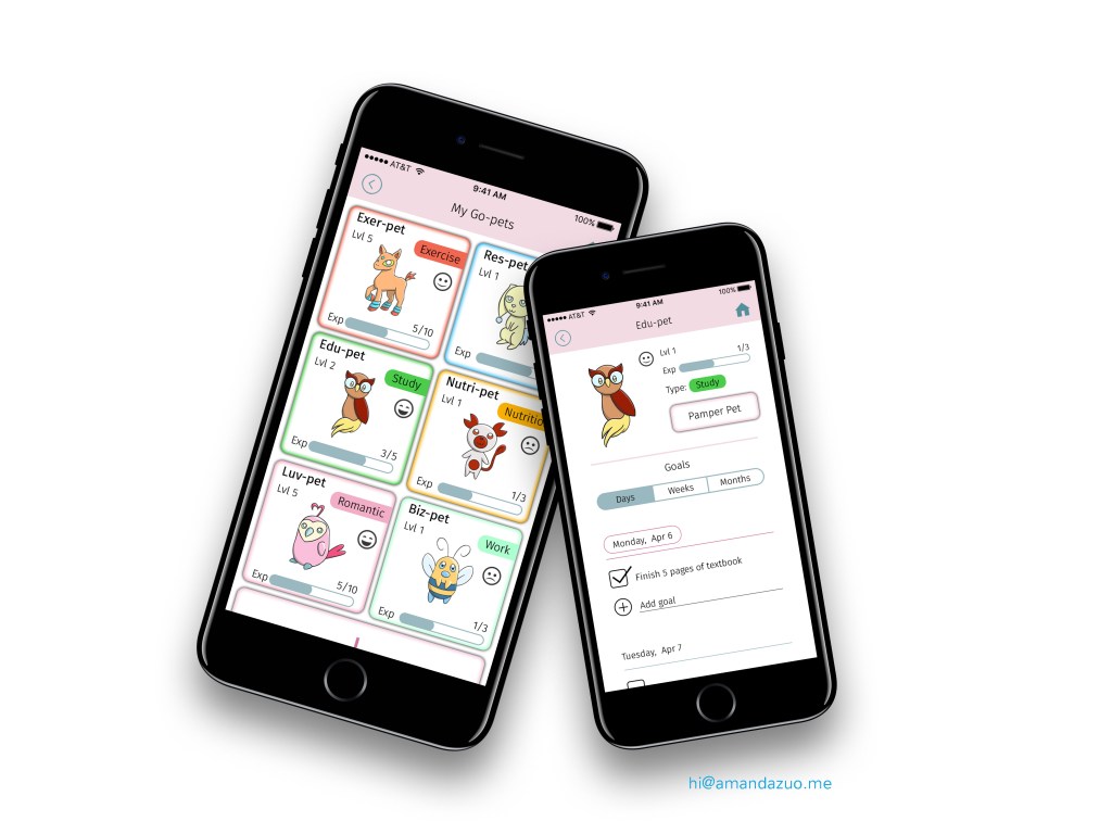 Here, the user can keep track of the goals they set, add new ones. Each time they record their progress, their Go-pet will gain “Experience.” When their Go-pet gains enough experience, it “levels up” as a reward.