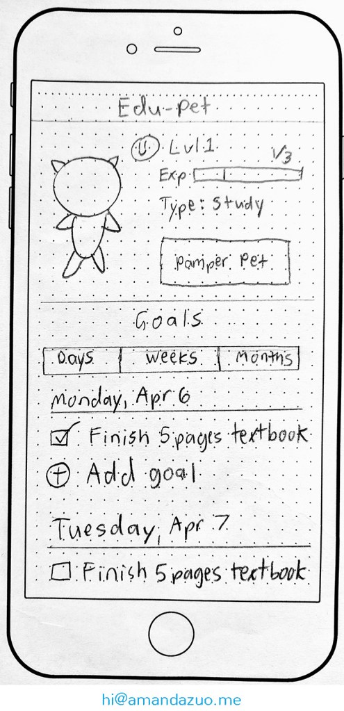 In my game, the user would have multiple virtual “Go-pets” (name derived from Goal + Pets), in which each Go-pet’s Type would represent a different category of self-improvement goals that they could set, such as Exercise, Nutrition, Education, and Work goals. The user would record their goals’ progress and be rewarded by their Go-pet gaining “Experience,” which when it gains enough, the Go-pet would gain a level. The user would also be able to care for each pet, activities such feeding, grooming, playing, and reading, which would improve its mood.